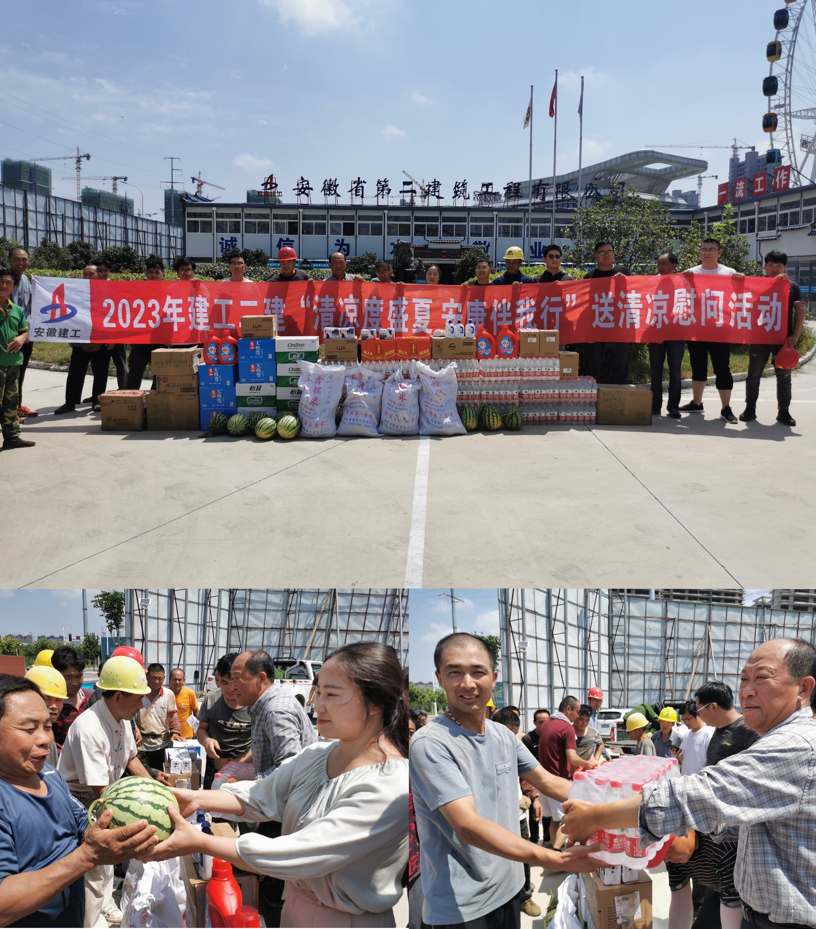 會后,為項(xiàng)目部一線職工發(fā)放“夏送清涼”物資。