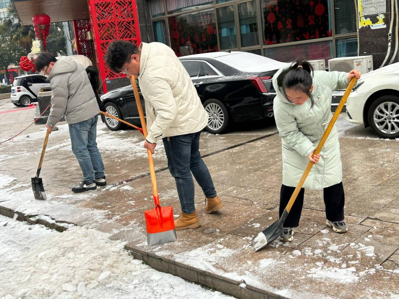 活動過程中,大家不畏嚴寒,揮舞著鐵鏟對停車場以及大門外的積雪和結冰進行清掃,經過一個多小時的奮戰,大家齊心協力,分工明確,配合默契,終于將積雪全部鏟除。雖然室外溫度很低,大家的衣服、鞋帽都已濕透,但勞動的熱情和團結的力量讓這個冬日變得格外溫暖。掃雪活動不僅保證了職工的出行安全,更通過此次活動,充分體現出分公司員工良好的精神面貌和團隊凝聚力。