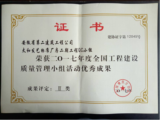 6月27—30日,安徽二建四分公司太和發(fā)藝標準廠房二期工程QC小組參加了由中國建筑業(yè)協(xié)會在四川成都主辦的全國工程建設(shè)優(yōu)秀質(zhì)量管理小組活動成果交流會。經(jīng)過激烈的評比,太和發(fā)藝標準廠房二期工程QC小組《提高混凝土框架柱觀感質(zhì)量合格率》憑借著“高標準、嚴要求”的技術(shù)管控榮獲2017年度全國工程建設(shè)優(yōu)秀QC成果二等獎。