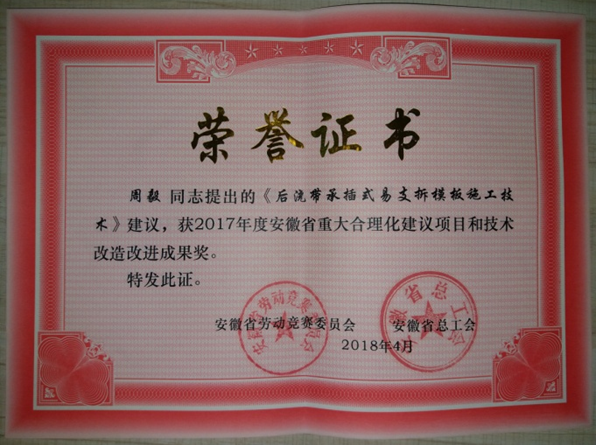 在日前召開(kāi)的安徽省慶祝“五一”暨“當(dāng)好主人翁、建功新時(shí)代”勞動(dòng)競(jìng)賽推進(jìn)大會(huì)上,對(duì)獲得榮譽(yù)稱號(hào)的先進(jìn)集體和先進(jìn)個(gè)人進(jìn)行了表彰頒獎(jiǎng)。我公司技術(shù)質(zhì)量部主任周毅提出的《后澆帶承插式易支拆模板施工技術(shù)》和副主任梅紅提出的《載體樁在軟土地基基礎(chǔ)中應(yīng)用》建議,雙雙榮獲2017年度安徽省重大合理化建議項(xiàng)目和技術(shù)改造改進(jìn)成果獎(jiǎng)。
