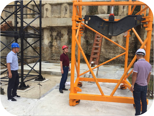 曹建深入現(xiàn)場,從大臂組裝、基節(jié)、標(biāo)準(zhǔn)節(jié)、爬升套架安裝等工序一一耐心指導(dǎo),對現(xiàn)場安裝安全及安裝質(zhì)量進(jìn)行嚴(yán)格把控。在曹總監(jiān)的正確指揮、大家團(tuán)結(jié)協(xié)作下,1#塔吊順利安裝完成。
