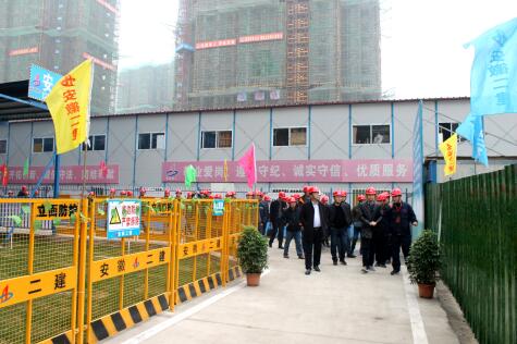 12月1日,安徽二建阜陽大學城•紅街項目、安建楓林源筑項目施工現(xiàn)場舉行了在建項目現(xiàn)場觀摩會?;顒又荚谏钊胪七M公司基礎(chǔ)管理深化年活動,充分發(fā)揮基層黨組織推動發(fā)展、服務(wù)職工、凝聚人心、促進和諧作用,使黨建工作更好地融入企業(yè)的生產(chǎn)經(jīng)營管理之中,進一步提高施工現(xiàn)場文明生產(chǎn)施工和安全質(zhì)量管理水平。公司黨委書記劉賢奇、副總經(jīng)理葉和永出席,所屬分公司黨支部書記、分管安全生產(chǎn)副經(jīng)理及安全科、綜合辦負責人、全體自營項目項目經(jīng)理、安全負責人、項目黨支部負責人參加觀摩會。