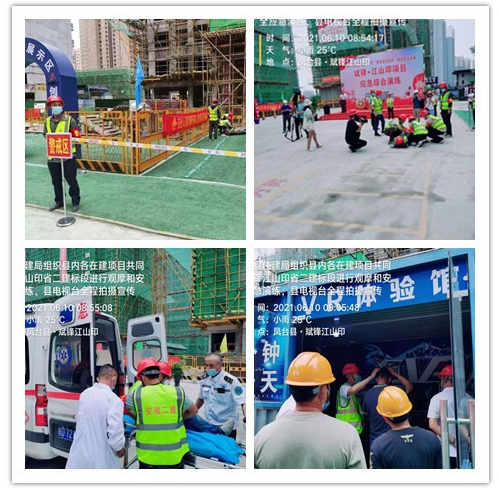 此次觀摩會由鳳臺縣住房城鄉建設局聯合鳳臺縣淮州置業有限責任公司、合肥市工程建設監理有限公司、安徽二建斌峰江山印項目聯合組織開展,應急綜合演練活動包含“消防應急救援”、“高空墜物”、“觸電事故”、“疫情防控”四個演練項目,由鳳臺江山印項目部各救援小組成員及藍天救援隊共20余人參加演練,縣住建局安監站及縣應急管理局、縣內施工和監理企業負責人及項目人員120余人參加了現場觀摩。