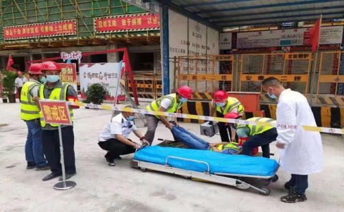 各救援小組準備就位開始演練,現場演練共分為車輛引導組、警戒組、通訊組、救援組、醫療組。第一個演練科目為:消防應急救援。各應急救援小組根據《消防應急預案》決定按程序啟動消防應急預案,應對出現的突發險情,各小組按照演練方案,從發現火情、立即啟動應急預案、接警救援到完成火源撲滅、人員受傷救援。第二個演練科目為:防高處墜落。模擬人員發生墜落意外后,項目醫療組及時趕到現場救治并撥打120急救電話。第三個演練科目為:觸電事故。模擬一工人操作失誤引發觸電,各小組立即趕往現場,對傷者進行搶救并送至醫院救治。最后一個演練科目為:疫情防控。模擬事故現場發現疫情疑似患者的應急處置流程。