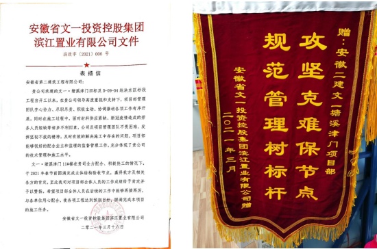 2021年3月31日,獲安徽省文一投資控股集團濱江置業有限公司表揚,并授予錦旗。