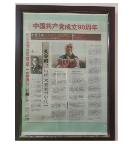 孔令科老人,1926年出生,1941年參軍入伍, 1946年加入中國共產黨,14歲加入新四軍,戎馬生涯中參加過抗日戰爭和解放戰爭,多次立下二等功。在講起那段槍林彈雨、戰火紛飛的革命年代時,他不免有些激動。令我們印象最深的是在戰爭中有五顆手榴彈滾到了他的腳下,幸運的是只有一顆爆炸了,導致右腿右臂受重傷,多處留有彈片。如今95歲高齡的孔老,身體硬朗、思維清晰,始終保持著每天讀書看報的好習慣,在靜享慢讀中,沉淀出生活的安靜與從容。如今的和平時代是無數革命先烈用鮮血和生命換來的,沒有他們浴血奮戰,何來祖國今日繁榮昌盛?臨走前,滿頭銀發的孔老不斷重復著:“你們生在好時代,大家都年輕,一定要多讀書多學習”。