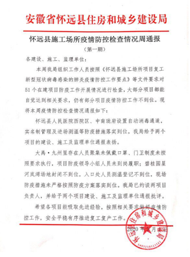 3月6日,懷遠縣縣長張明廷、住建局局長崔華、質檢站站長褚建新一行到安徽二建懷遠中南瓏府項目指導復工復產和疫情防控工作。