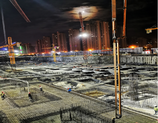 此時夏風不燥正是大干好時節阜陽吾悅廣場工地人頭攢動機器隆隆,夜間依舊燈火通明,混凝土泵車猶如出水蛟龍顛頭播腦一支建筑大軍正不分晝夜忙碌著,他們為了施工節點正在發起猛攻。