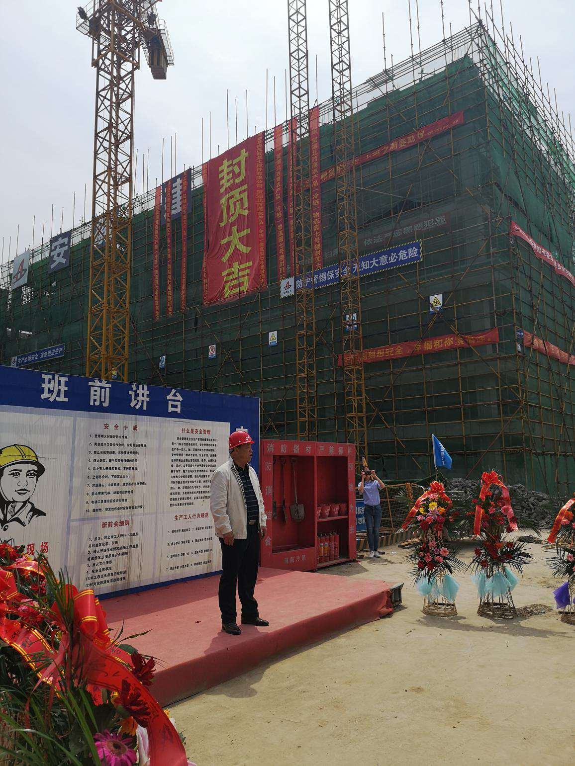 4月18日上午,安徽二建湖北陽新西商農產品(冷鏈)物流園一期工程1#、5#、7#、9#、11#、13#主體結構封頂儀式隆重舉行。湖北省西商農產品(冷鏈)物流園有限公司總經理劉俊、建設單位項目負責人張鼎、外聯負責人李輝、安徽二建四分公司黨支部書記董建民等相關領導共同見證了封頂時刻