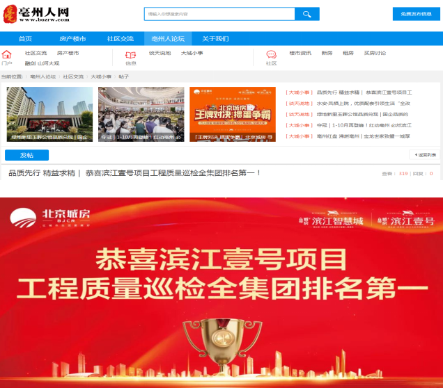 第四分公司亳州濱江壹號項(xiàng)目喜獲北京城房集團(tuán)工程質(zhì)量巡檢第一名